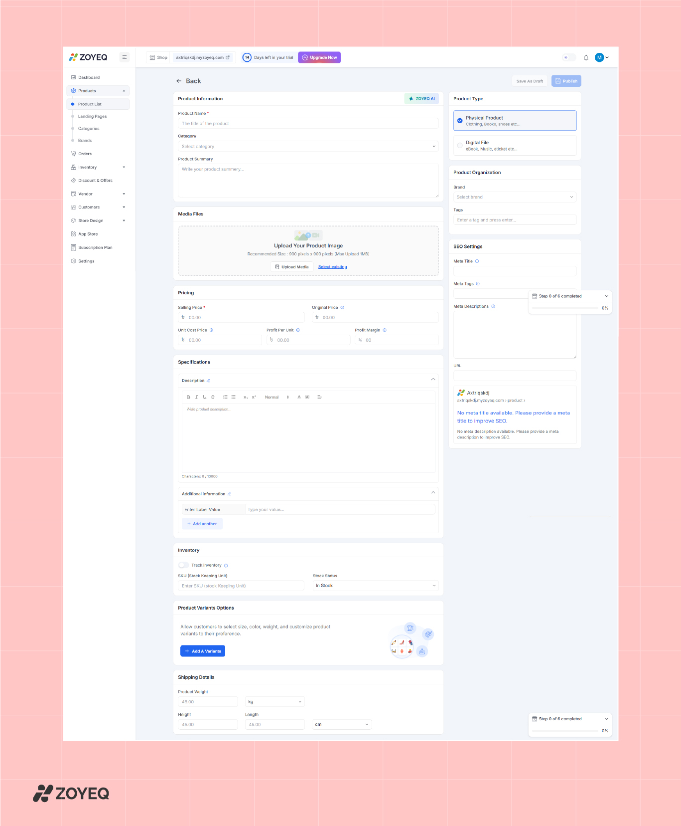 ZOYEQ makes this process simple with built-in fields for all details, including inventory tracking and shipping weight. You can also select whether it's a physical product or a digital file (like an ebook or download). ZOYEQ allows you to manage variants (like size or color) and even add profit margin tracking.