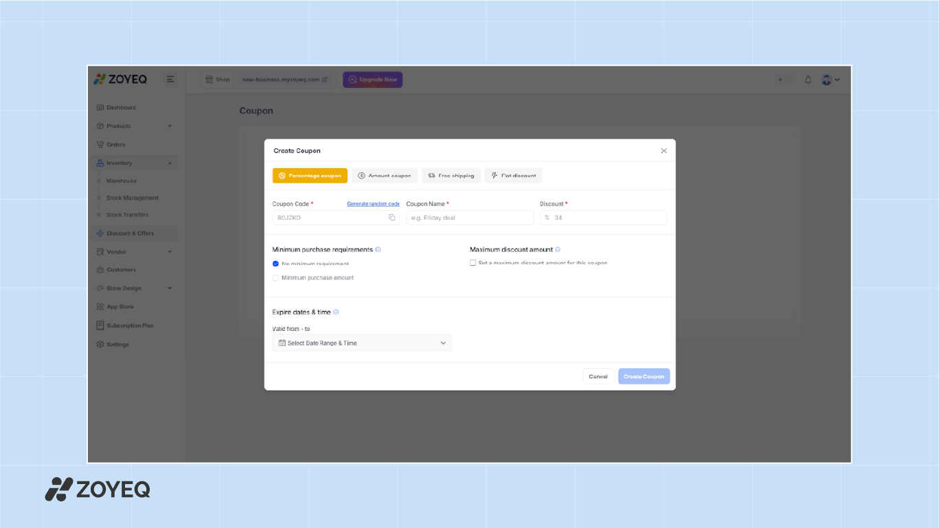 If you're running discounts, use the Discount & Offers section to create coupons, set conditions, and define expiration dates.
