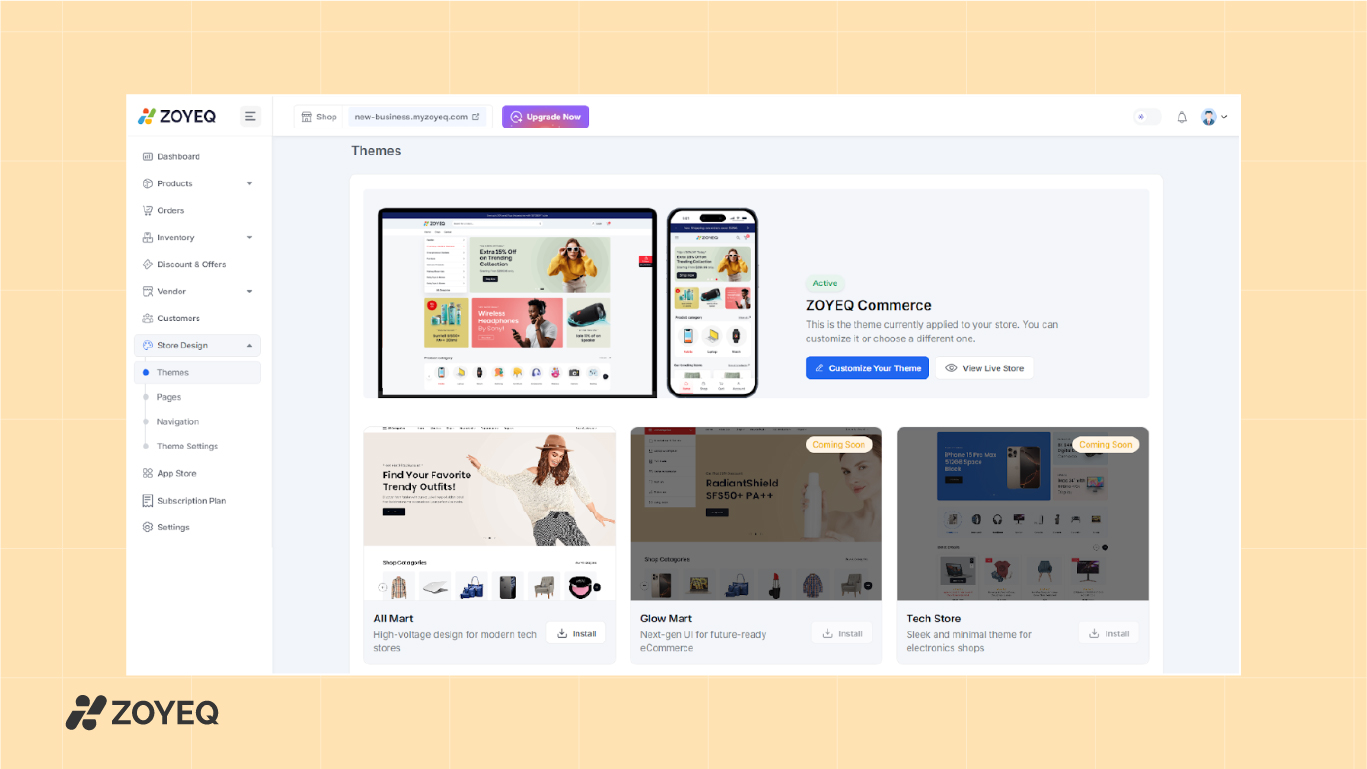 ZOYEQ's design system is structured but flexible. Go to Store Design > Themes to choose a eCommerce website layout that fits your brand. Each theme is optimized for mobile and comes with a ZOYEQ Commerce, All Mart, or Tech Store modern layout.