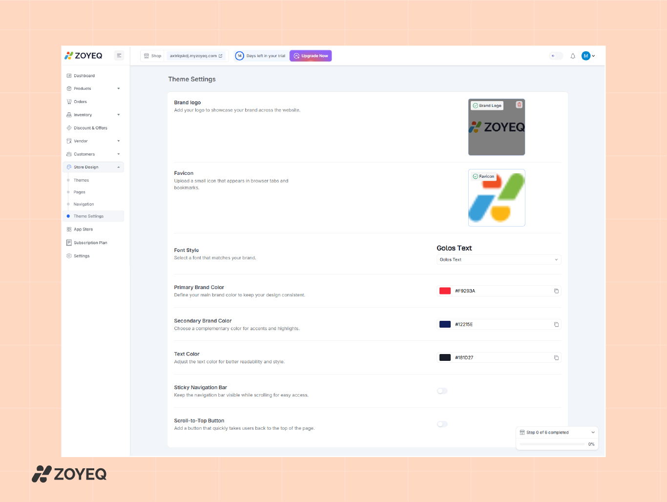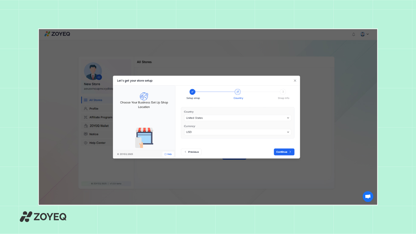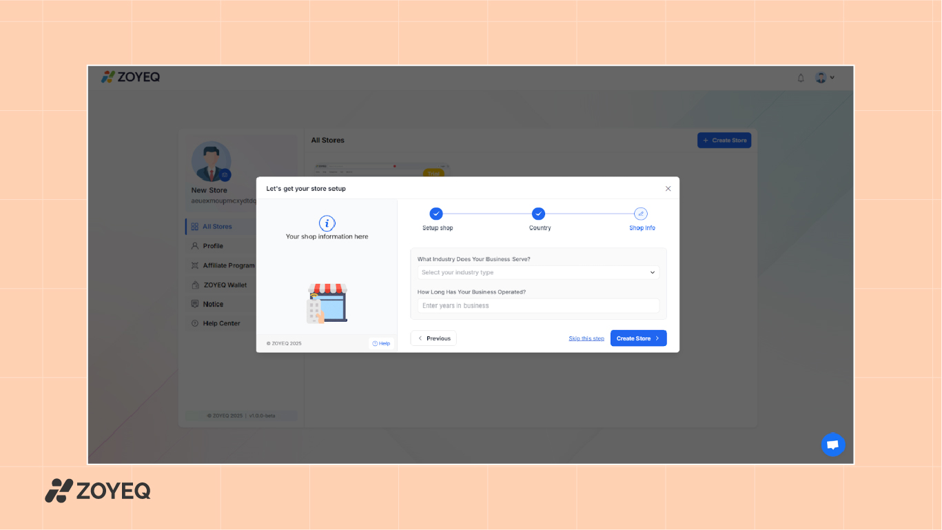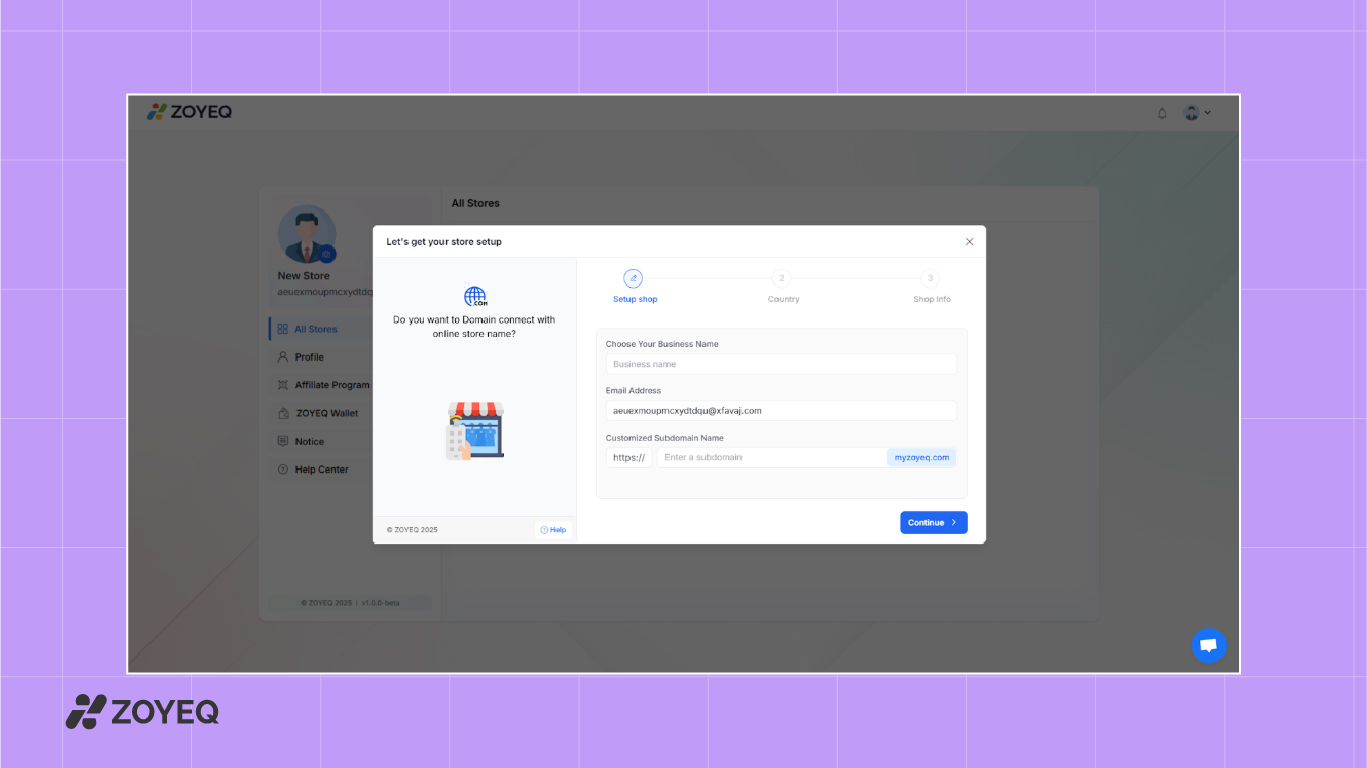 Enter your business name, email address, and customize your store's subdomain (e.g., yourbrand.myzoyeq.com). You can also connect your own custom domain later if needed.