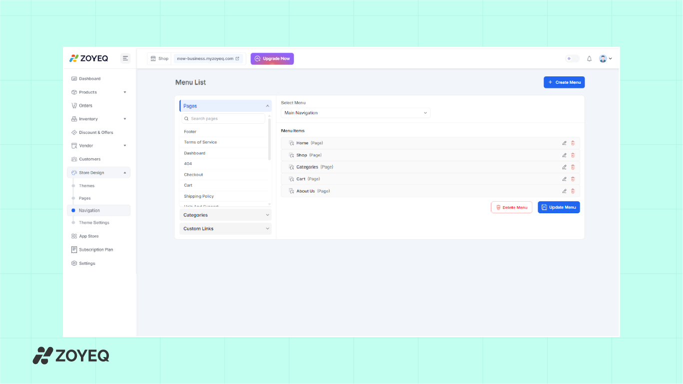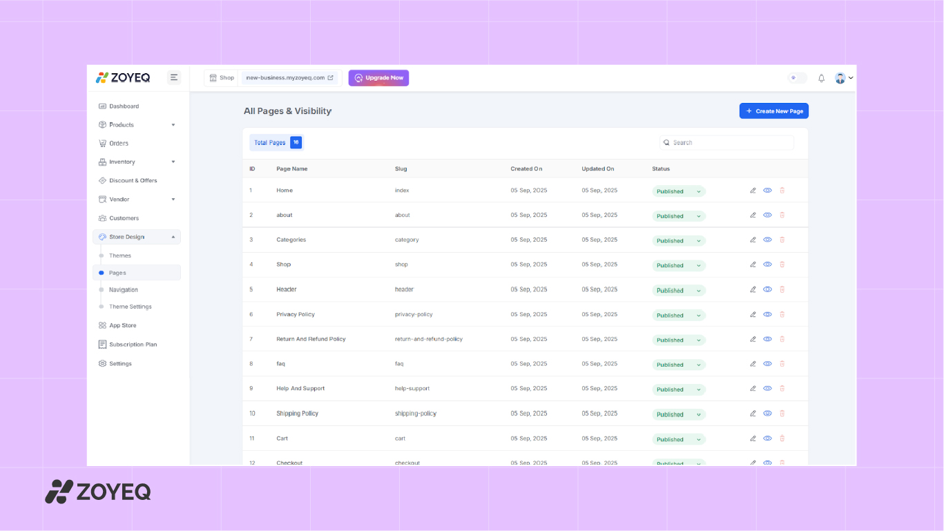 ZOYEQ automatically creates essential pages, including Home, Shop, Checkout, Cart, About Us, FAQ, Privacy Policy, and Contact. To view or update these, go to Store Design > Pages . You can publish/unpublish pages or create custom ones as needed.