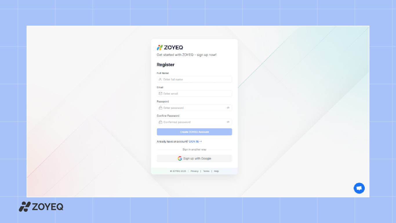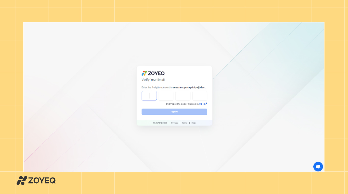 Visit zoyeq.com and sign up for a free account. You can register using your email or sign up directly with Google. Once your account is created, you'll be asked to verify your email with a short 4-digit code.