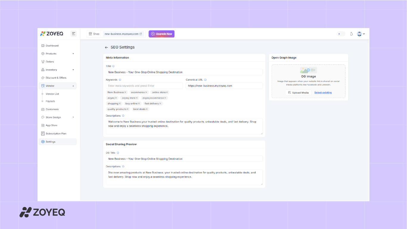 ZOYEQ also includes built-in SEO settings, so you can edit metadata and improve visibility without extra plugins.